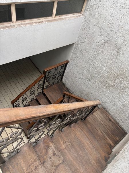 Cocina con barra de material (alacenas a reparar), sala y comedor amplios con una división de madera solida