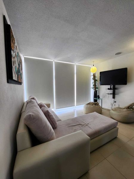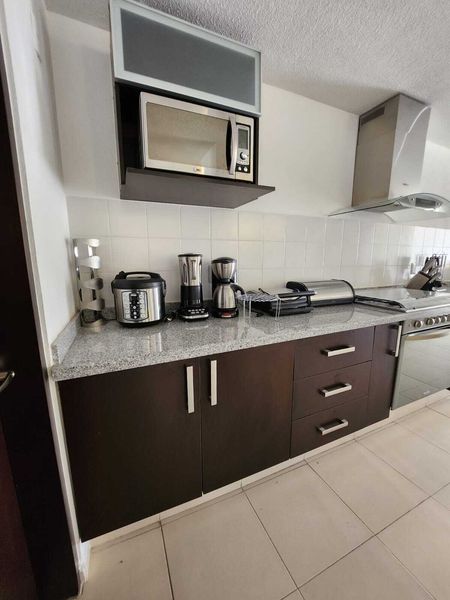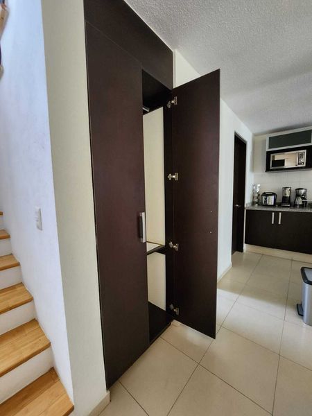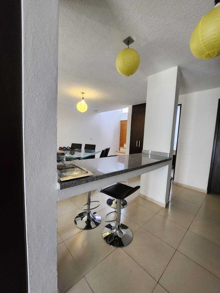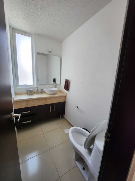 Casa en renta amueblada y equipada en condominio en Santa Fe Juriquilla con seguridad 24/7 y salón de usos múltiples, gimnasio, alberca y juegos infantiles. Cuenta con dos cuartos con baño completo y recámara principal con vestidor.