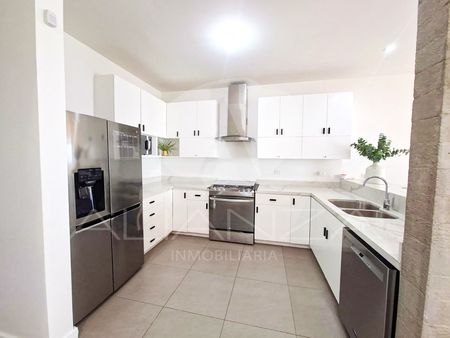 Entrando, encontrarás la cocina equipada con estufa, campana, lavavajillas, refrigerador, microondas y barra con bancos; también encontrarás un cuarto que puedes utilizar como cuarto de servicio o lavado; espaciosa área de sala comedor con muebles y medio baño para tus visitas.