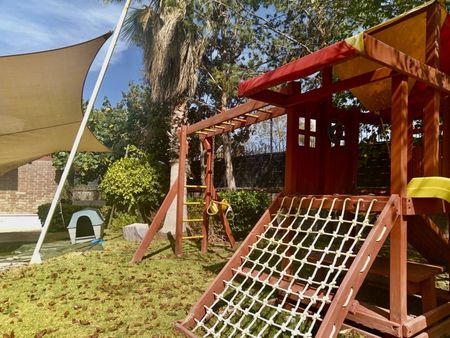 Jardín con juegos infantiles y canchita de fútbol con pasto, ideal para que los más pequeños disfruten al máximo.