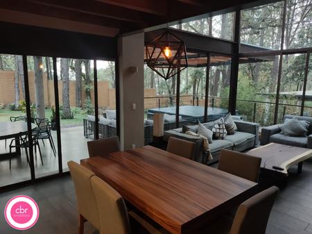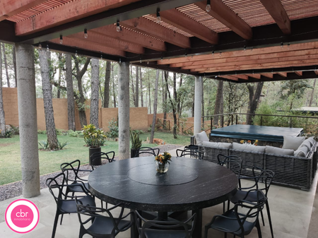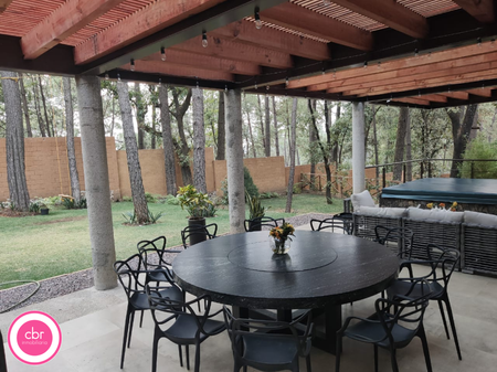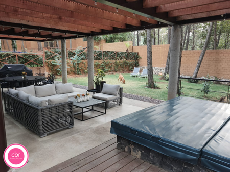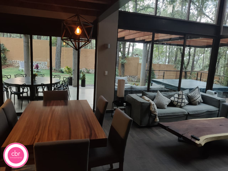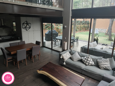 El área social se distingue por su sala y comedor con chimenea, una cocina abierta, y una terraza equipada con asador, comedor para 8 personas, y una sala ideal para disfrutar al aire libre. Además, la casa cuenta con un jacuzzi, una alberca y un jardín privados, ofreciendo un espacio exclusivo para relajarse.