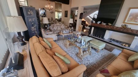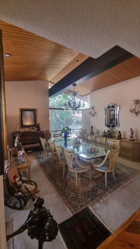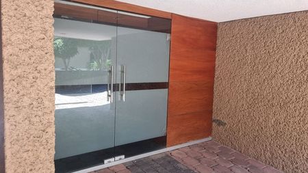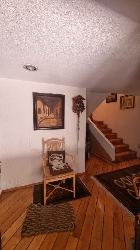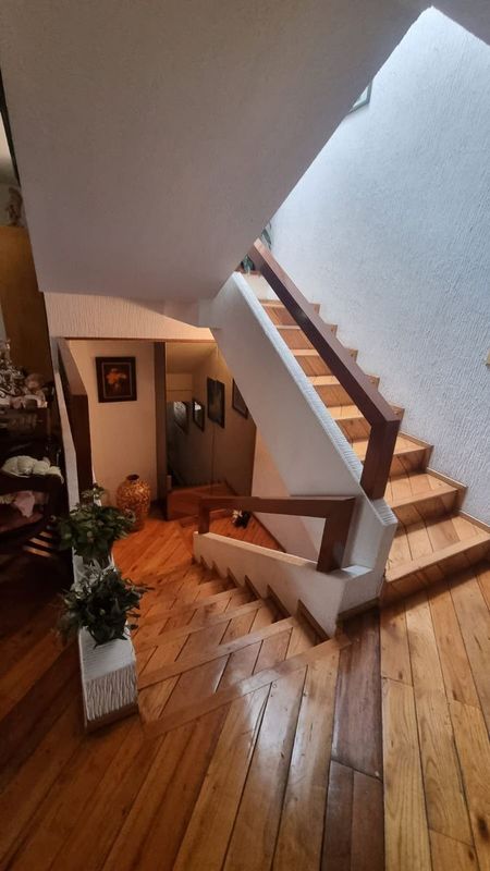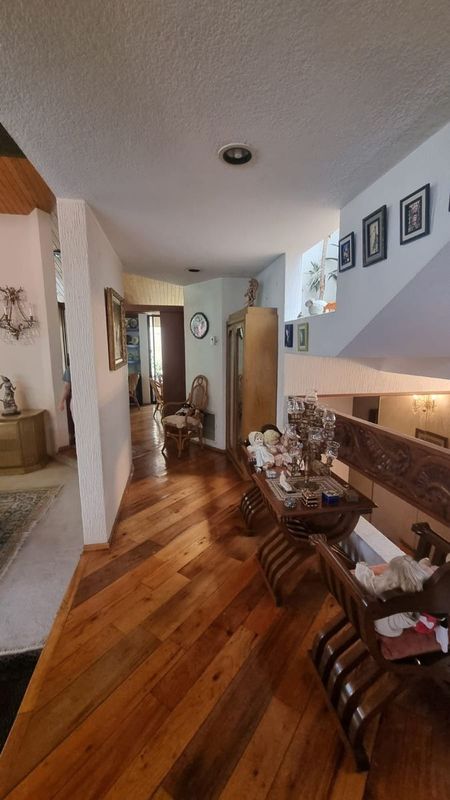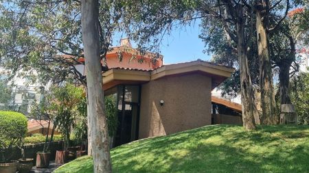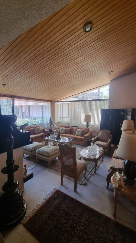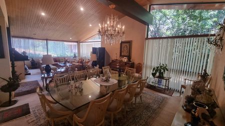 Planta baja: medio baño de visitas, sala con chimenea, comedor, family y antecomedor (con piso de madera y puerta corrediza de madera) terraza techada y salida al jardín con árboles de duraznos, manzano y limón; cocina con despensa; 4ta recámara con baño completo y clóset pequeño, closet de blancos, recámara principal con salida directa a jardín parte delantera y entrada, vestidor, baño con doble lavabo y tina. Entrada de servicio, cuarto de servicio, cuarto de lavado con baño.