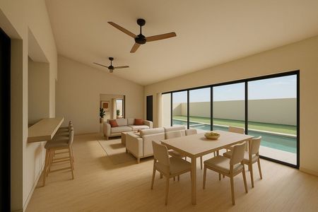 La Residencia esta construida en un nivel y se distingue por la sensación de amplitud con sus techos altos y grandes ventanales, son 500 m2 de construcción que te ofrece en el área social: sala, comedor y la cocina con alacena, el estudio con baño completo, todo se conecta al exterior para que disfrutes la vista al canal de nado y un amplio jardín (860 m2) arbolado.