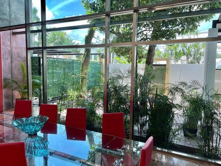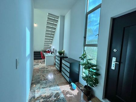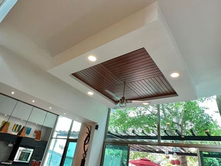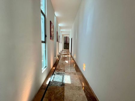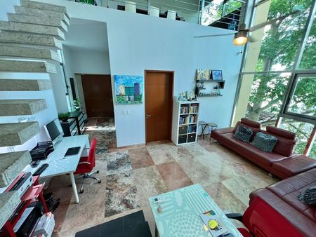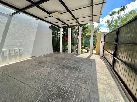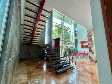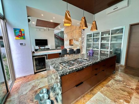 Cocina muy amplia de espacio abierto equipada con encimera de mármol blanco, isla con mármol negro y barra para desayunar para 6 personas. Cuenta con estufa, horno empotrado, lava vajillas y muchos gabinetes. Sala y comedor con mucha luz natural. Cuarto de servicio grande con su propio baño con espacio para almacenar, cuarto de lavandería, gran jardín con alberca, áreas verdes, hermosos arboles de sombra, con su linda terraza, área de asador y pérgola.
