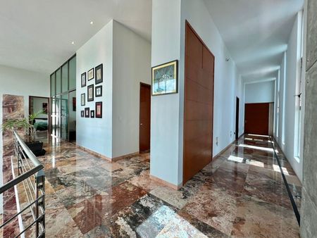 Moderna casa estilo contemporáneo, con concepto de espacios abiertos y muy amplios. Techos de doble altura en toda la casa, orientación lado sombra, con mucha luz natural y excelente ventilación. La casa cuenta con acabados de mármol, cristales anticiclónicos con nano tecnología aislantes del calor y conservación del frio, equipada con 30 paneles solares lo cual tiene un consumo de luz mínima: son tres medidores y cada uno paga como $100 pesos bimestrales, cochera para 4 automóviles con portón eléctrico, alberca propia con caída de agua y área de asoleadero. Cuenta con un muro de luz doble altura de Onix que divide las áreas.