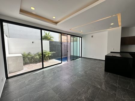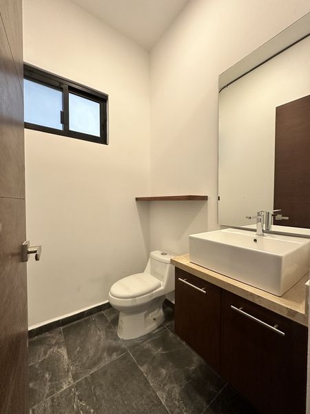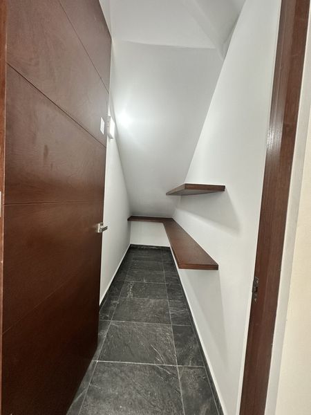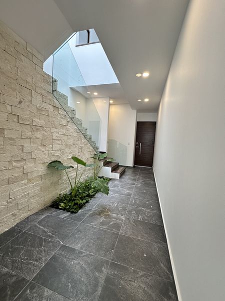 Planta Baja: Recibidor, Amplia sala comedor, cocina integral equipada con alacena, instalación para recibir lavavajillas, cuarto de lavado, 1/2 baño de servicio, terraza con alberca equipada con timer, estacionamiento techado para 3 autos, pasillo lateral, cisterna, una recamara/estudio con closet y baño completo.