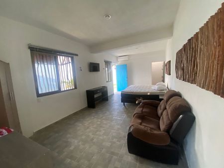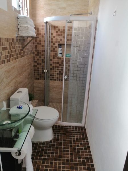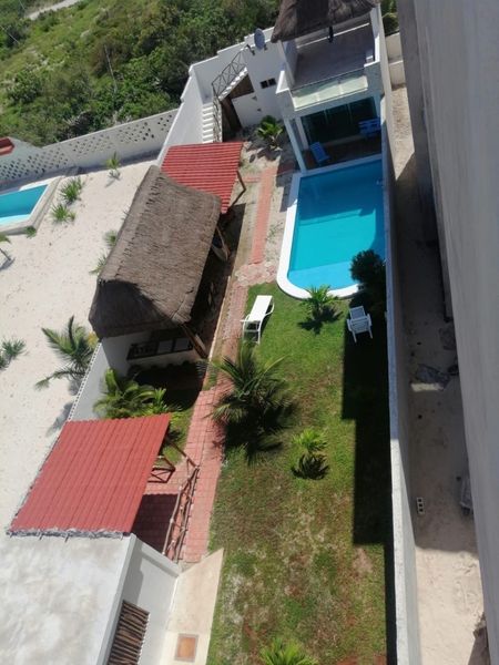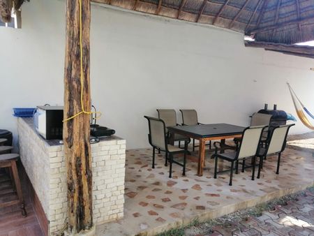 La cocina esta en el área de palapa, baño completo que da servicio al área social y a la alberca.