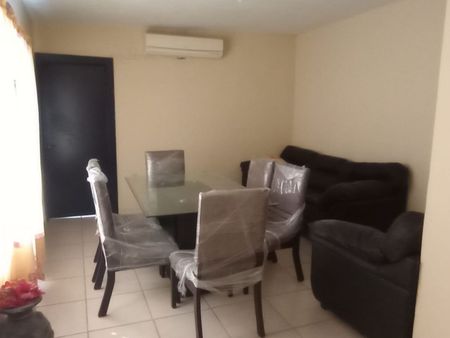 - En la planta baja, cuenta con estacionamiento techado para dos autos, un amplio espacio de sala comedor con aire acondicionado, una cocina integral equipada con todo lo necesario, un patio trasero con asador para disfrutar de tus reuniones familiares o con amigos, y un medio baño de visitas.