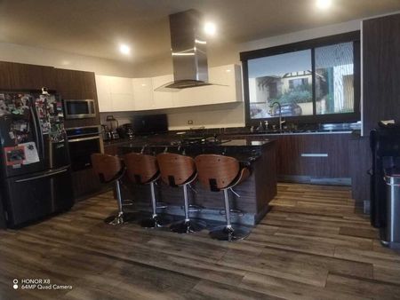 Cuenta con 4 recámaras, 4 baños completos, 1 medio baño, cocina equipada, cuarto de servicio, área de lavado, jardín y estacionamiento techado para 4 vehículos.