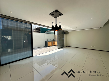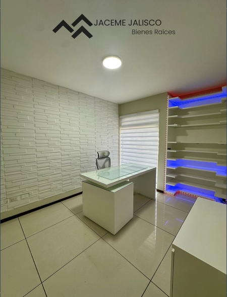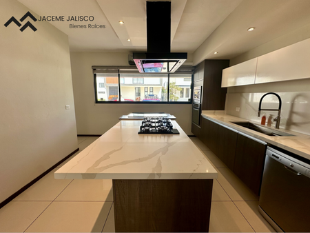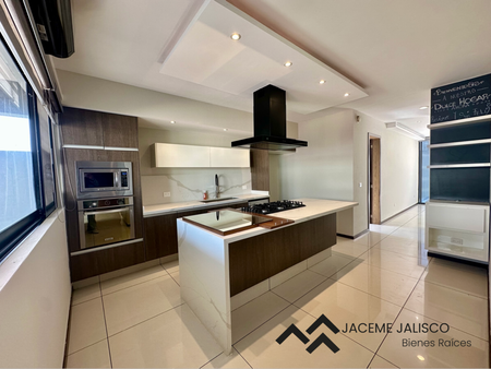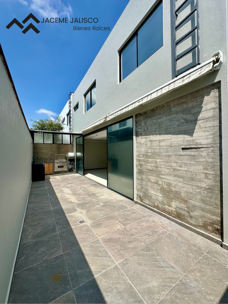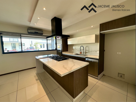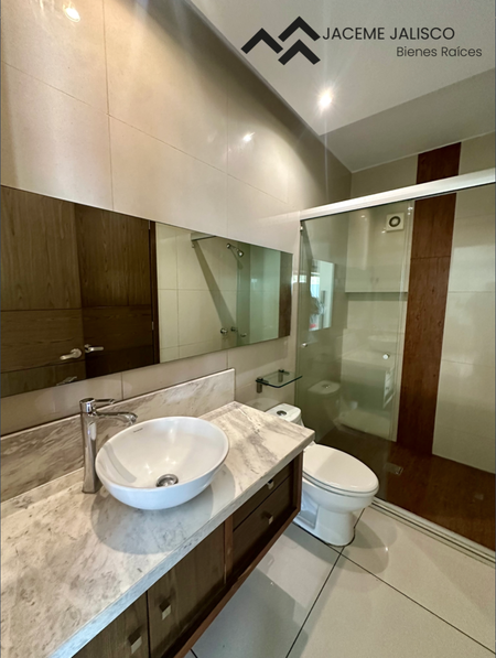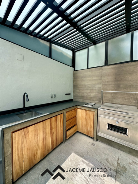 Planta baja: Amplia sala-comedor, Árbol interior a doble altura, cocina equipada con amplia isla, estudio o posible 5ta recamara, baño completo. Terraza, barra con asador. Amplia área de lavado, cuarto de servicio con baño completo. Cochera para dos autos y pasillo lateral.