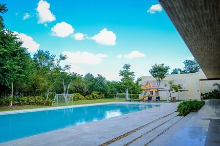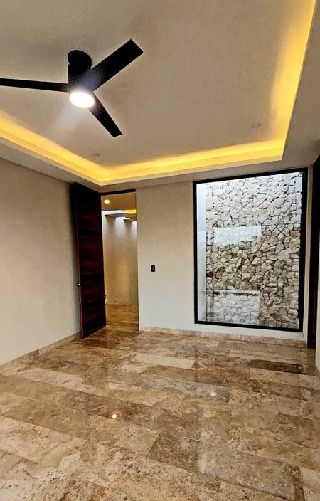 Residencia de estilo moderno y minimalista, con líneas limpias y volúmenes geométricos. Su fachada combina tonos neutros con detalles en madera y piedra, ofreciendo un contraste elegante. Amplios ventanales aportan luz natural y amplitud, mientras que su diseño de dos niveles equilibra estética y confort.