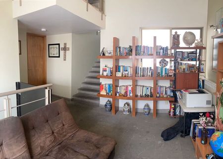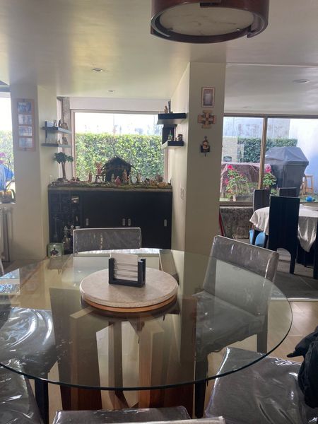Cuarto de tele y biblioteca (Family room), cocina, sala y comedor amplios, medio baño.