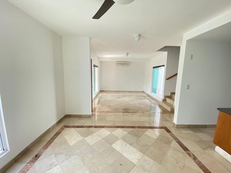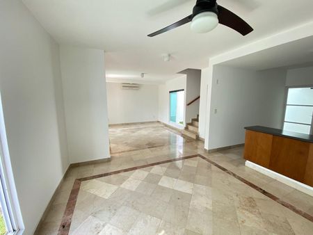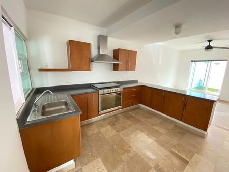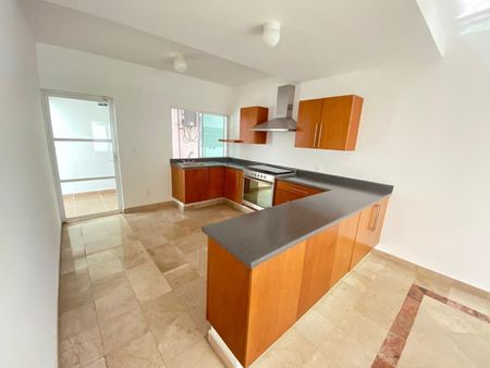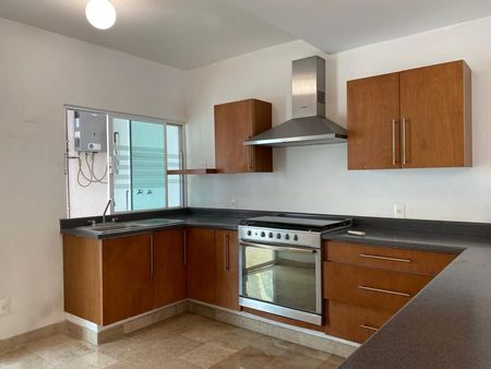 Cuenta con 3 recámaras climatizadas con clósets, 2 baños completos, medio baño para visitas, cocina integral en acabados de madera equipada con estufa, campana y barra desayunadora, sala comedor, área de lavado y tendido, garage techado para 1 auto con portón eléctrico, jardín, dos bodegas y balcón.