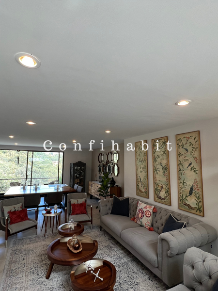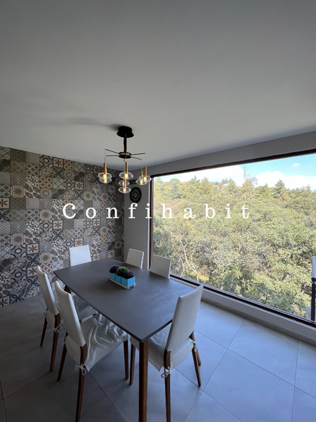 - Amplia estancia en sala y comedor, el comedor tiene salida a una terraza con vista al bosque