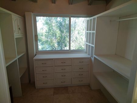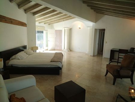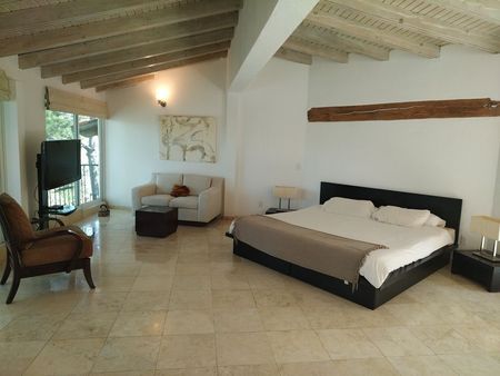 Recamara secundaria equipado con baño y closets con vistas al bosque y al lago desde ventanal y con acceso a gran terraza.