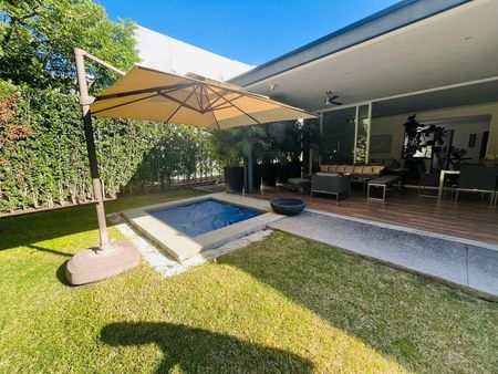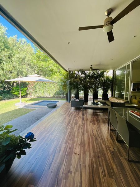 Cuenta con amplio jardín con asador, terraza con Jacuzzi, estudio, cuarto de servicio, cuarto de TV.