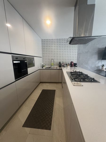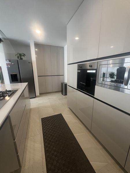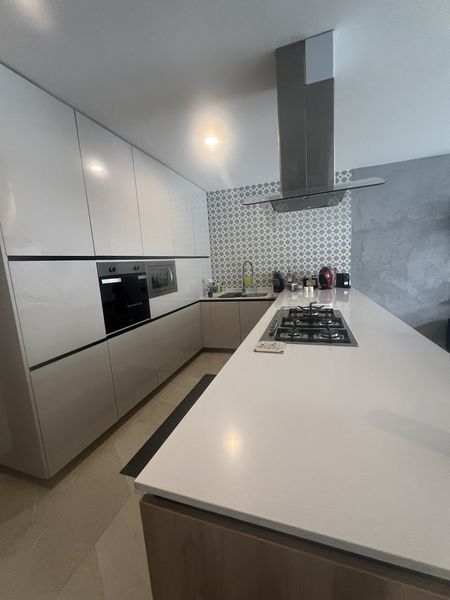 La cocina es abierta y con material de alto brillo.