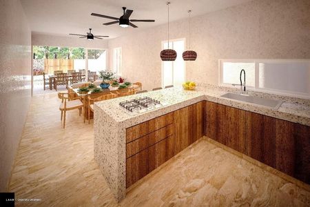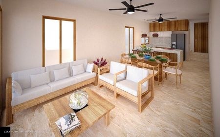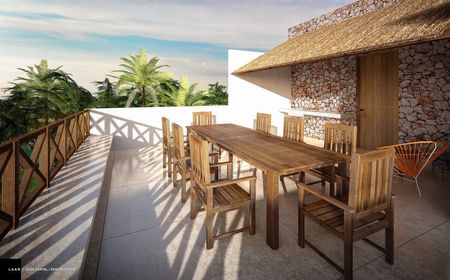 Su concepto abierto conecta sala, comedor y cocina con una terraza techada y alberca privada, mientras que el rooftop con palapa y cocineta brinda vistas privilegiadas.