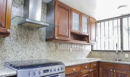 Ubicada en la parte baja de Tecamachalco, cuenta con un jardín arbolado con asador en la parte de enfrente que se conecta con la sala, comedor independiente, cocina equipada con un ante comedor y family room.