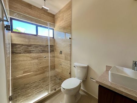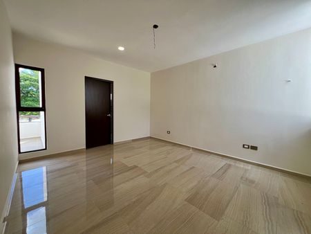 Recámara principal amplia con closet vestidor, baño y terraza trasera con vista a la piscina.