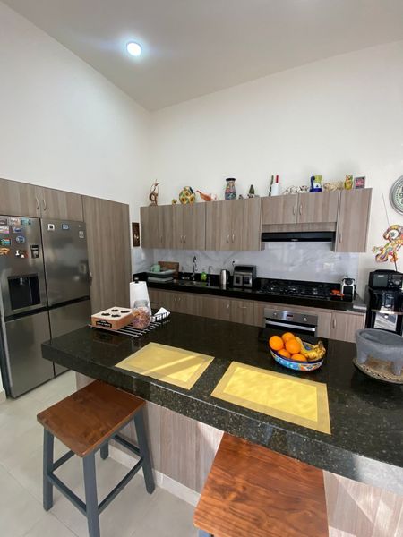 Cocina americana totalmente equipada con horno de gas, parrilla de 5 quemadores, campana extractora y alacena