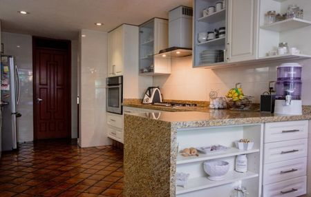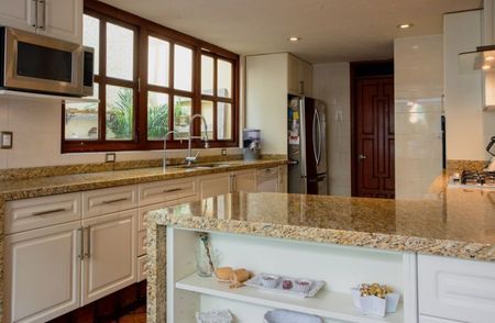 Cuenta con 3 recamaras con baño completo, estudio, cocina abierta con barra de granito renovada y antecomedor, comedor, sala, cantina, cuarto de tv, baño de visitas, barra de bar, cuarto de lavado, cuarto de servicio con baño completo, estacionamiento de visitas.