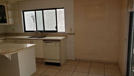 **cocina equipada con su barra central, alacena grande y espacio para un desayunador con ventanal, salida y vista hacia el jardín.