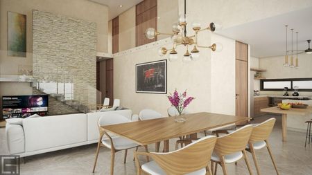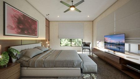 ‒ Recámara principal con vista a la piscina, clóset vestidor y baño completo con espejo, canceles de vidro templado, muebles y accesorios de baño, meseta recubierta de piedra crema maya con lavabo in built y revestimientos según diseño