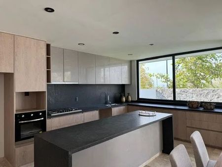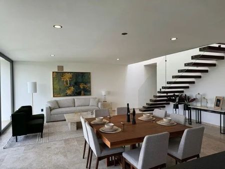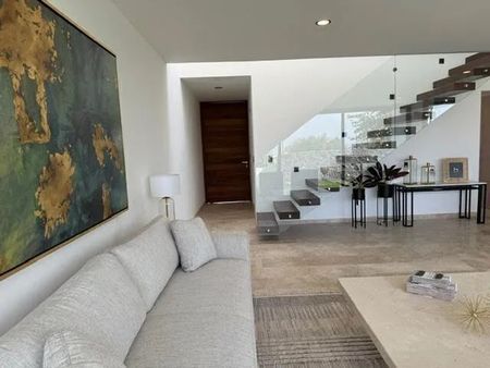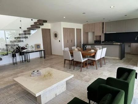 Planta baja: garage techado para 3 vehículos, baño de visitas, sala, comedor, cocina equipada, estudio con baño completo o cuarta recámara en planta baja, cuarto de servicio con baño, jardín, terraza, cuarto de lavado.