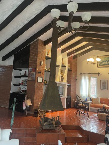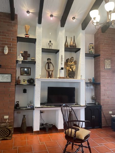 Baño de visitas, sala y chimenea, recibidor, comedor, cocina con barra.