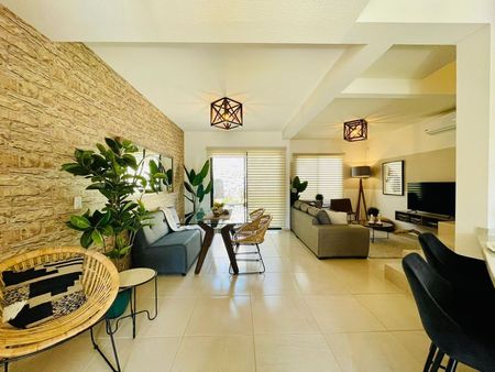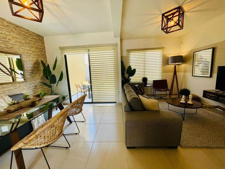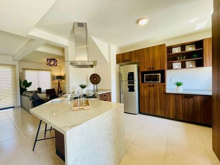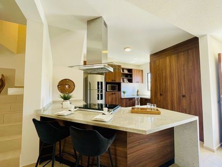 -Cocina con barra desayunadora y comedor con vista al jardín