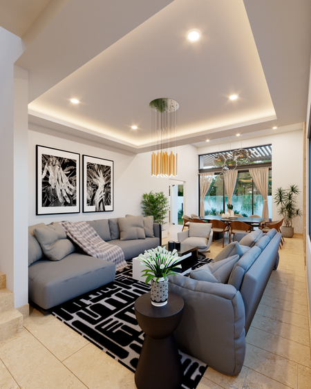 - Comedor corrido con techos a doble altura, vista al jardín trasero y salida a la terraza