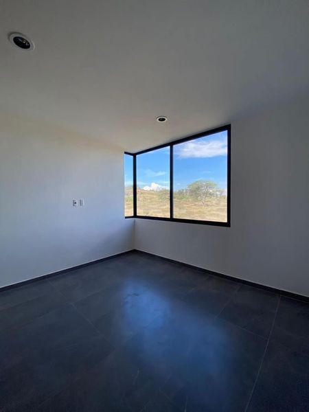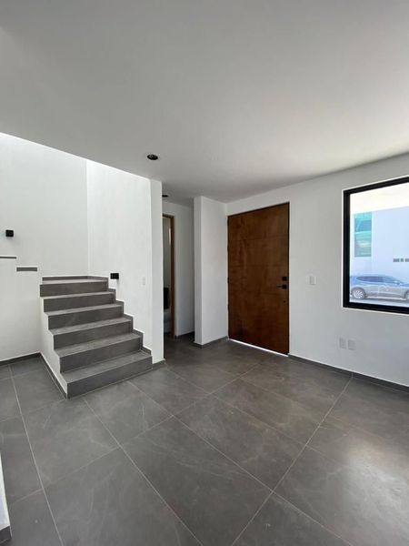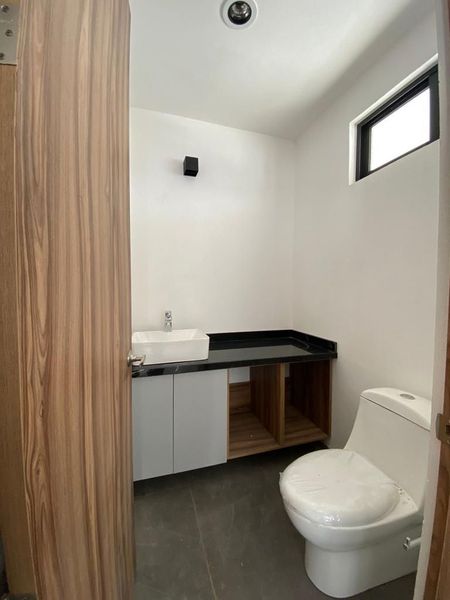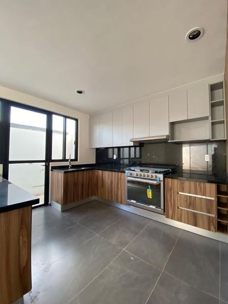 Estilo moderno, en dos plantas. En planta baja sala comedor con vista al jardín,cocina integral con cubierta de granito, alacena y barra con guarda, baño de visitas con cubierta de granito, pasillo de servicios y cochera para dos autos.