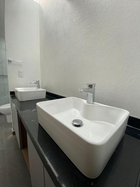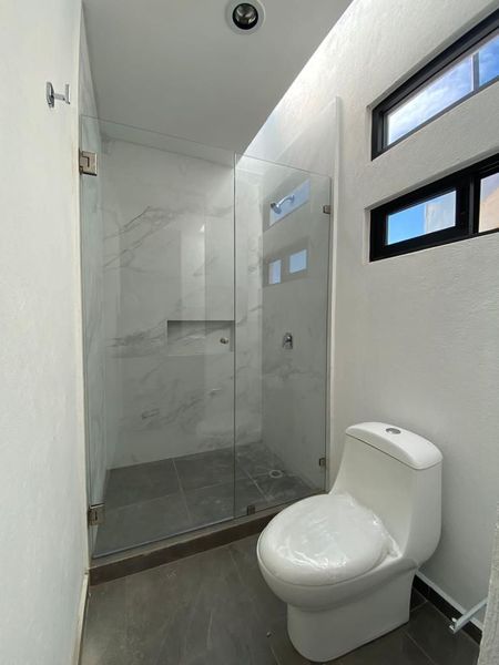 En planta alta: recámara principal con walk in closet y baño completo con granito y cristal templado. las recámaras secundarias con closet incluido, un baño completo con cubierta de granito y cristal templado, sala de TV ó estudio