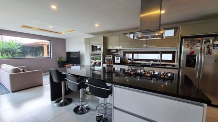 La cocina es abierta, se encuentra totalmente equipada con isla desayunadora de cuarzo, aquí mismo se encuentra la parrilla y la campana, espacio muy amplio de alacena.