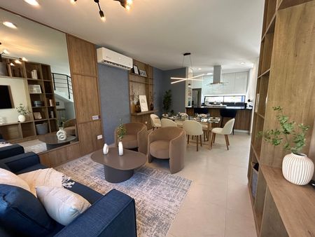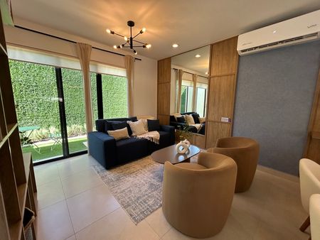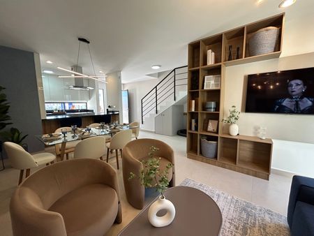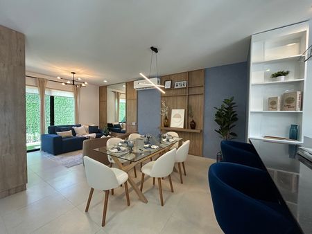 Sala - comedor conectada a la cocina, jardín y espacio para dos vehiculos.