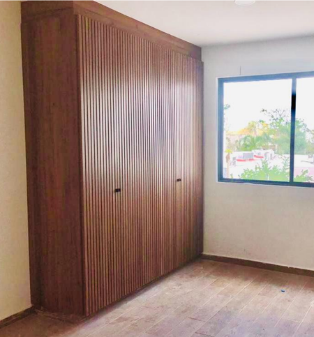 CABECERO DE SALA COMEDOR. CLOSETS DE RECÁMARAS CON ESTRUCTURAS Y PUERTAS DE MELAMINA DE IMPORTACIÓN VISIÓN Y ROBLE MÉRIDA