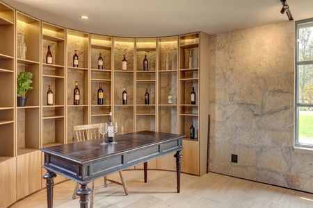 La cocina, equipada con electrodomésticos de alta calidad, incluye un refrigerador de doble ancho y generosos espacios de almacenamiento. El amplio comedor disfruta de vistas pintorescas, mientras que la oficina/biblioteca, con estanterías curvas hechas a medida, ofrece un refugio para la concentración o la lectura.