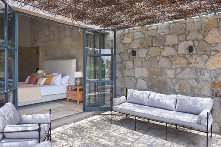 La sala de estar, con techos altos y un bar hecho a medida, es el corazón de la casa. Sus amplias puertas se abren hacia un acogedor espacio exterior que cuenta con: