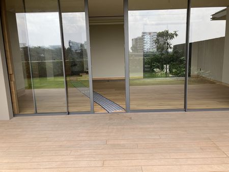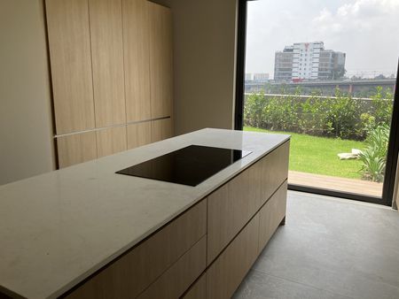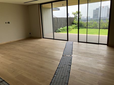 En planta baja se encuentra sala comedor con puertas corredizas de vidrio hacia una terraza cubierta de 35 mts aproximadamente y jardín de 70 mts aproximadamente con preciosa vista. Medio baño de visitas, cocina con salida al jardín, isla y pantry. lavandería y cuarto de servicio. 4 lugares de estacionamiento cada casa separados uno de otro. No se estorba ningún coche. Bodega. Cuenta también con baño completo de servicio en garaje. Cisterna. Instalación para instalar paneles solares y para minisplits. Toda la casa tiene instalacion eléctrica. No se usa gas
