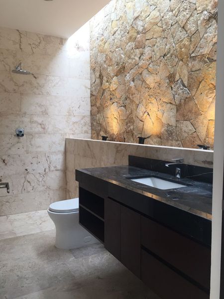 Mesetas de baño en mármol con lavabos bajo cubierta y grifería Helvex