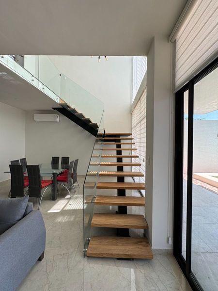 • Escalera de madera y barandal de cristal templado