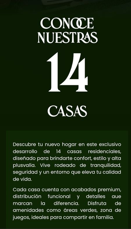 Vive la experiencia de un hogar pensado para confort, estilo y plusvalía asegurada. Este exclusivo conjunto de 14 casas ofrece acabados premium, una distribución funcional y detalles únicos que elevan tu calidad de vida, todo dentro de un entorno con seguridad 24/7.