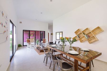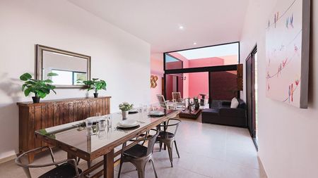 La Quinta Modelo H le ofrece un espacio funcional con tres recámaras que cuentan con tres baños y la recámara principal con closet-vestidor, sala, comedor, cocina, cochera techada para dos autos, terraza, cuarto de lavado y área de servicios.