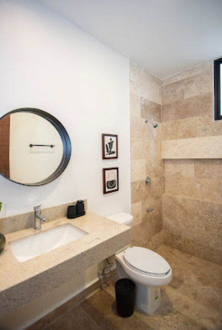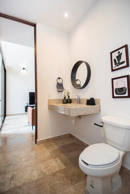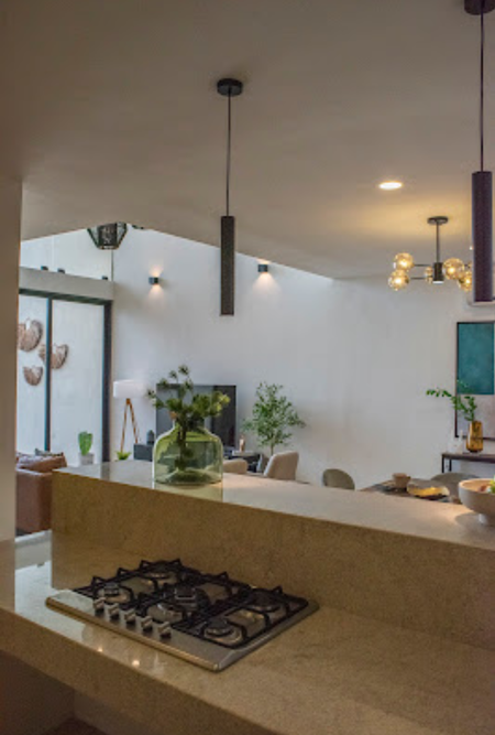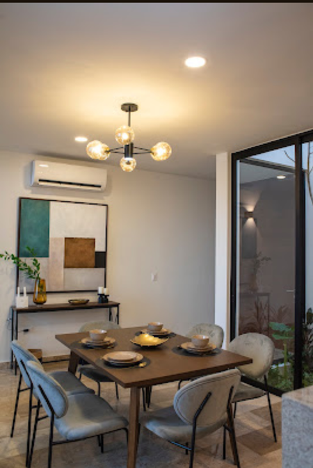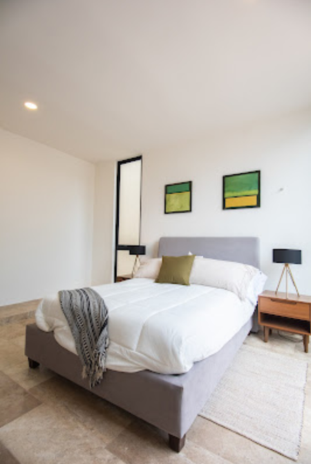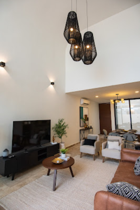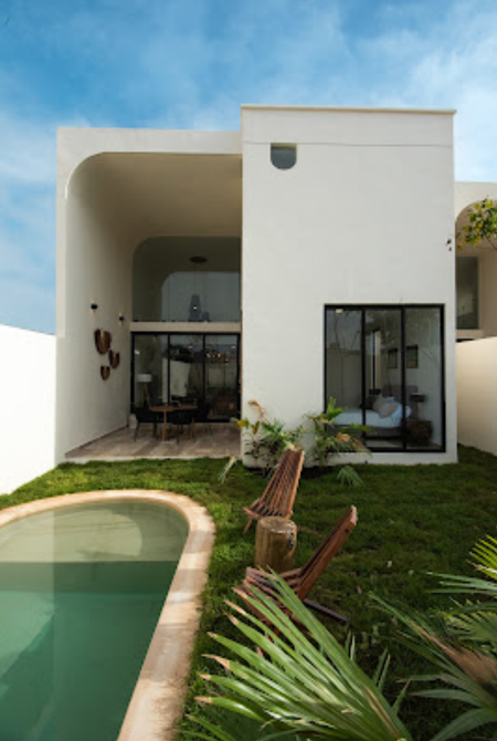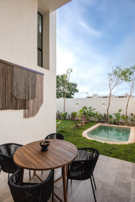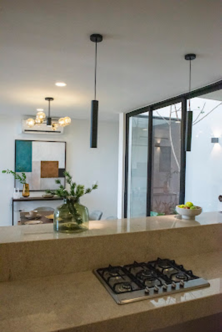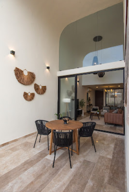 estilo Bauhaus, con pisos de mármol, acabados chukum con orientación Norte-Sur, preparación para paneles solares, Banquetas en el entorno del conjunto residencial.