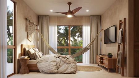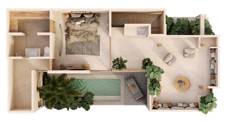 •Amplia terraza con barandal de madera tipo bajareque con vista al área de la alberca