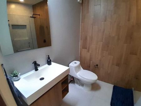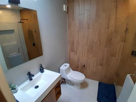 Dos lugares de estacionamiento, área de recibidor/estudio o flex space, medio baño de visitas, cocina con alacena y espacios abiertos, sala- comedor con salida al jardín.