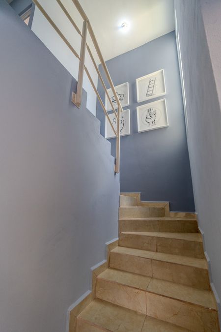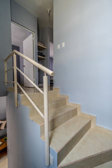 Exteriores e interiores.- Afine con estuco + Dos manos de pintura. Recubrimiento en muro entre ventanas.- Loseta de cerámica imitación madera Recubrimiento en muro de escalera.- Loseta de cerámica 60 x 60. Muro en baño.- Placa de Yeso + Dos manos de pintura.