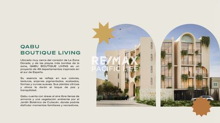 UN PROYECTO QUE TE DARÁ LA TRANQUILIDAD DEL MAR EN LA CIUDAD, UBICADO A SOLO 220 METROS DE LA PLAYA Y DE CLUB SHEKINAH, muy cerca del corazón de La Zona Dorada, y de las playas más bonitas de la zona, QABU BOUTIQUE LIVING es un proyecto de 49 departamentos inspirado en el sur de España. Su esencia se refleja en sus colores, texturas, enjarres pigmentados, acabados, formas y curvas suaves. Sus plantas cítricas y olivos le darán el toque de paz y tranquilidad. Qabu cuenta con áreas al aire libre llenas de armonía y una vegetación ambiente por el Jardín Botánico de Culiacán, donde podrás disfrutar momentos familiares y recreativos. QABU BOUTIQUE LIVING está dirigido al disfrute, a la tranquilidad y al negocio de las rentas vacacionales y cuenta con unidades enfocadas para ello.