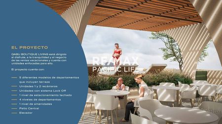 El proyecto cuenta con: 5 diferentes modelos de departamentos que incluyen terraza, Unidades 1 y 2 recámaras, unidades con sistema Lock O, 1 nivel de estacionamiento techado, 4 niveles de departamentos, 1 nivel de amenidades, patio central y elevador. QABU BOUTIQUE LIVING, respetando el compromiso con sus clientes de brindar el espacio y la tranquilidad que se merecen, entrega las unidades equipadas y listas para habitar. Las unidades cuentan con cocina integral con parrilla y microondas con campana, así como closets. O para comenzar a generar ingresos en el negocio de las rentas vacacionales, lo que hace a QABU BOUTIQUE LIVING la inversión perfecta para aquellos que quieren un espacio para disfrutar pero también estar en plataformas de renta vacacional.